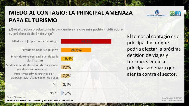 Previsiblemente, el estudio confirma que el temor al contagio es el principal factor que podría afectar la próxima decisión de viajes y turismo, siendo la principal amenaza que atenta contra el sector. El segundo elemento que afectarían los viajes es la pérdida de poder adquisitivo.