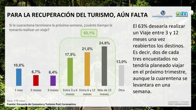 A pesar del entusiasmo por viajar, la recuperación turística se realizará lentamente siempre y cuando en el país haya un control de la pandemia, como hasta ahora. Es por ello que el 63% desearía realizar un viaje entre 3 y 12 meses, una vez reabiertos los destinos.