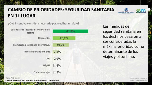 Es decir, dos de cada tres encuestados no tendría planeado viajar en el próximo trimestre, aunque la cuarentena se levantara en una semana. Y a eso se le suma que las medidas de seguridad sanitaria en los destinos pasaron a ser consideradas la máxima prioridad como determinante de los viajes y el turismo.
