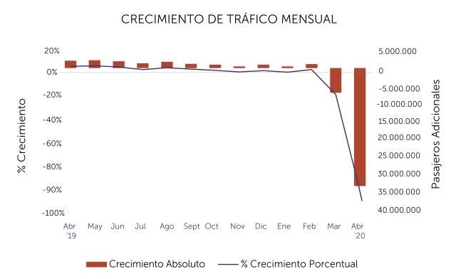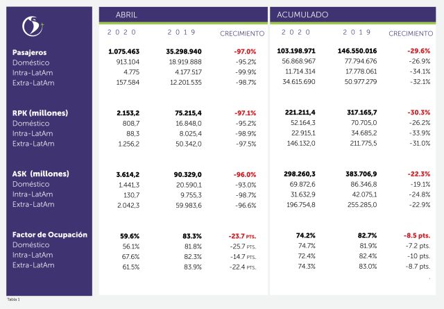 Agregó que «Solo los mercados de México, Chile y Brasil operaron en abril y aun así presentaron reducciones superiores al 90% en el tráfico de pasajeros. Las rutas con más operación fueron México D.F. – Cancún con 42.300 pasajeros, Sao Paulo – Rio de Janeiro con 30.419 pasajeros y Santiago de Chile – Calama con 22.200 pasajeros. En el mercado internacional, México DF – Houston con 6.100 pasajeros, Sao Paulo – Frankfurt con 5.900 pasajeros y México DF – Atlanta con 5.600 pasajeros».