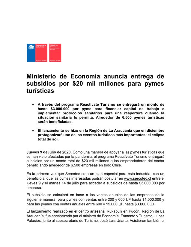 El subsecretario de Turismo, José Luis Uriarte, valoró la iniciativa, destacando que la industria turística cuenta con el potencial para convertirse en un motor de la reactivación económica del país. En esa línea, indicó que “estamos trabajando con sentido de urgencia en tres focos: apoyos económicos para la sobrevivencia de las empresas, puesta a punto a través de protocolos sanitarios y reactivación, con una fuerte campaña de promoción nacional. Hoy quisimos entregar esta buena noticia desde la Región de La Araucanía, que cuenta con un tremendo potencial turístico y que, además, en diciembre de este año será el centro de un nuevo hito turístico: el eclipse total de sol, que esperamos sea una fiesta ciudadana que ayude a miles de emprendedores nacionales a ponerse nuevamente de pie”.