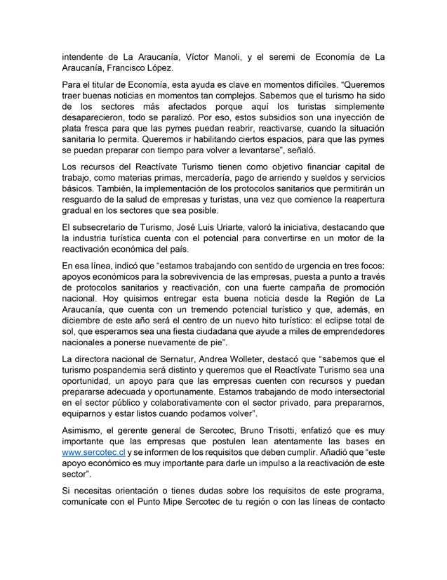 Asimismo, el gerente general de Sercotec, Bruno Trisotti, enfatizó que es muy importante que las empresas que postulen lean atentamente las bases en www.sercotec.cl y se informen de los requisitos que deben cumplir. Añadió que “este apoyo económico es muy importante para darle un impulso a la reactivación de este sector”.