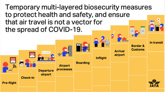 IATA en conjunto con la Organización Mundial de la Salud (OMS), el Consejo Internacional de Aeropuertos (ACI) y la Organización de Aviación Civil Internacional (OACI), han elaborado la guía “Takeoff” (“Despegue”) con una serie de medidas para mitigar los contagios basado en un enfoque de capas. Al estar validada por OACI, la propuesta está reconocida por los Gobiernos por lo que existe una cierta incongruencia entre las medidas adoptadas a nivel multilateral macro con las que se adoptan a niveles internos.