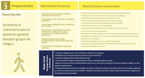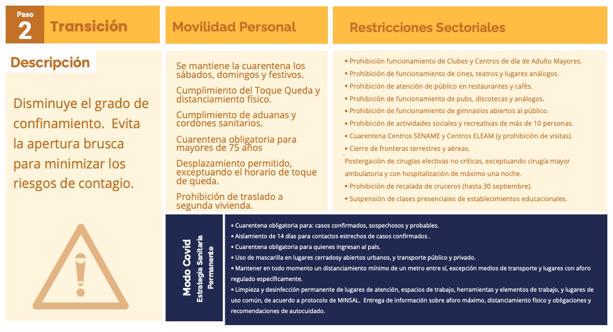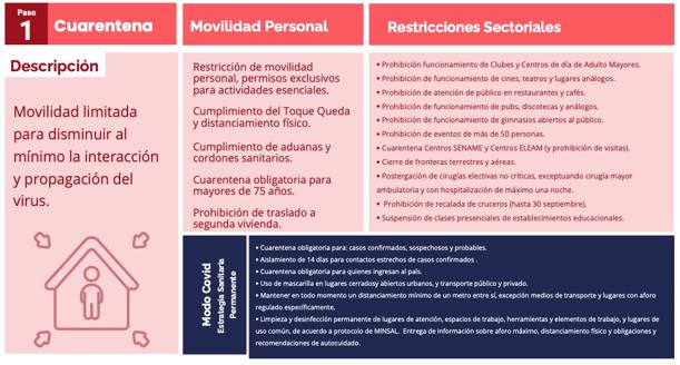 Según el plan de desconfinamiento “Paso a Paso”, el Gobierno de Chile indica que las cuarentenas obligatorias a personas que ingresen a Chile desde algún país extranjero, así como los viajes nacionales sin ningún tipo de restricción se mantienen hasta nuevo aviso o a la implementación del Paso 5 de “Apertura Avanzada” que permite retomar actividades con restricciones sectoriales. El objetivo busca reducir al mínimo la movilidad de las personas.