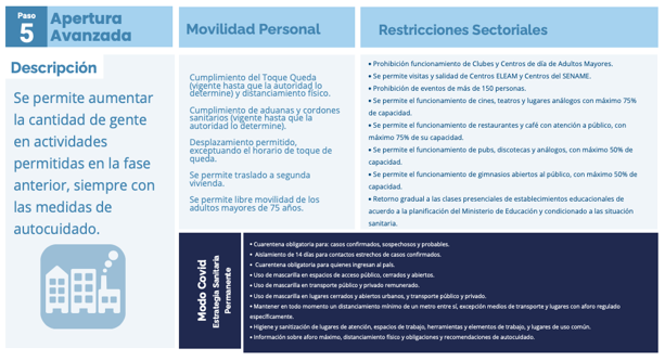 El plan del Gobierno no presenta novedad alguna respecto a lo que debiera ser una estrategia normal de salida o el ejemplo de otros países. Con cinco escenarios o pasos (como los define la autoridad) van desde la cuarentena, vigente actualmente en la mayoría del país, hasta la apertura avanzada, cada una con restricciones y obligaciones específicas. La autoridad señala que el avance o retroceso de un paso particular a u otro está sujeta a indicadores epidemiológicos, red asistencial y trazabilidad.