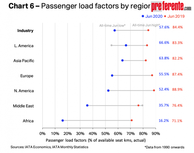 Las ocupaciones, de su lado, también superan en Asia Pacífico y en Sudamérica el 60 por ciento, mientras en Europa y Norteamérica se sitúan entre el 55 y el 52 por ciento, siendo las más afectadas las de Oriente Medio, con un 35,7 por ciento, ya que los grandes hubs del Golfo donde operan Emirates, Qatar y Etihad se encuentran bajo mínimos con las restricciones a los vuelos internacionales y de larga distancia.