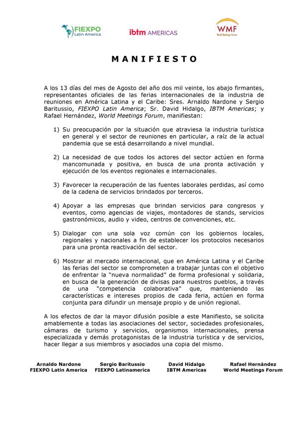 Con motivo de la conferencia realizada el jueves 13 de agosto por los representantes oficiales de las ferias internacionales de la industria de reuniones en América Latina y el Caribe, se redactó el manifiesto conjunto que publicamos a continuación.