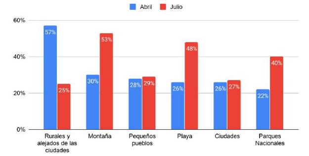 Al momento de hablar sobre qué tipos de lugares tendrán una mayor relevancia al momento de viajar, los destinos Rurales y alejados de las ciudades habían sido los más elegidos en la encuesta de abril. Sin embargo, en el último relevamiento, Montaña y Playa fueron las dos preferencias de los pasajeros, que, según explica el estudio, se pueden identificar “con destinos de turismo tradicionales de los argentinos y de los períodos vacacionales tanto de invierno como de verano”.