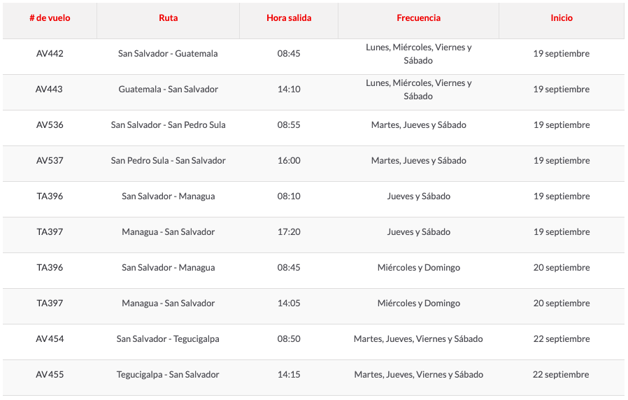 Según el plan inicial de restablecimiento de la conectividad, se plantea llegar a 9 de los destinos con mayor demanda en Centro y Norteamérica, para lo cual utilizará una flota de aviones Airbus A319 y A320, con capacidad para 120 y 150 pasajeros respectivamente.