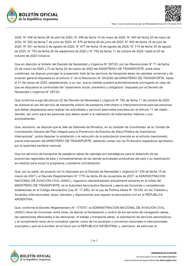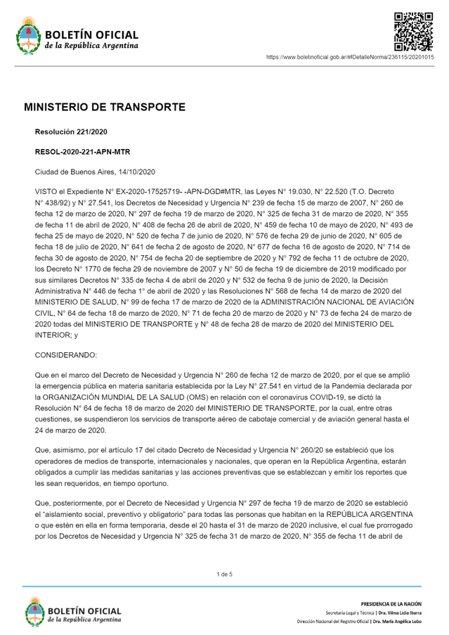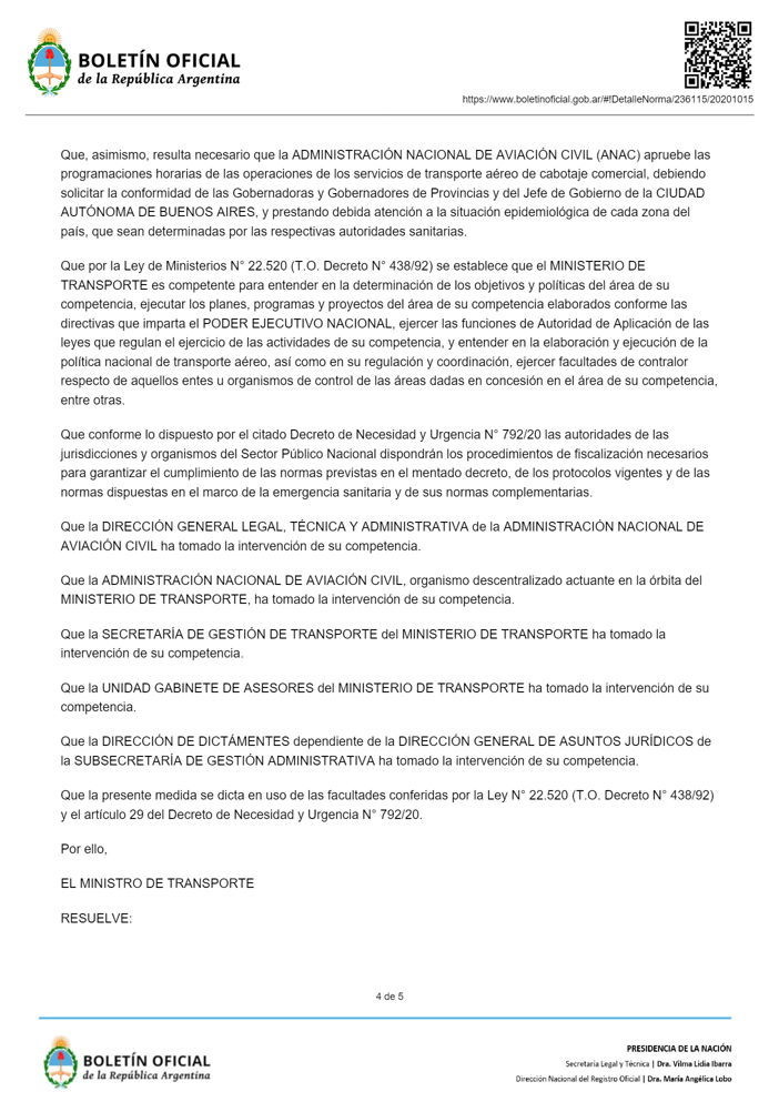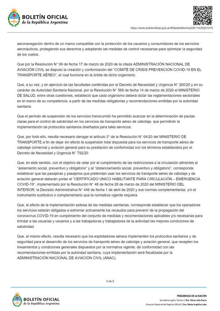 La norma también indica en su artículo 2° que las compañías aéreas deberán contar con «procedimientos y protocolos elaborados de conformidad con los lineamientos y recomendaciones» del Ministerio de Salud, y que la implementación de los mismos será fiscalizada por la Administración Nacional de Aviación Civil.