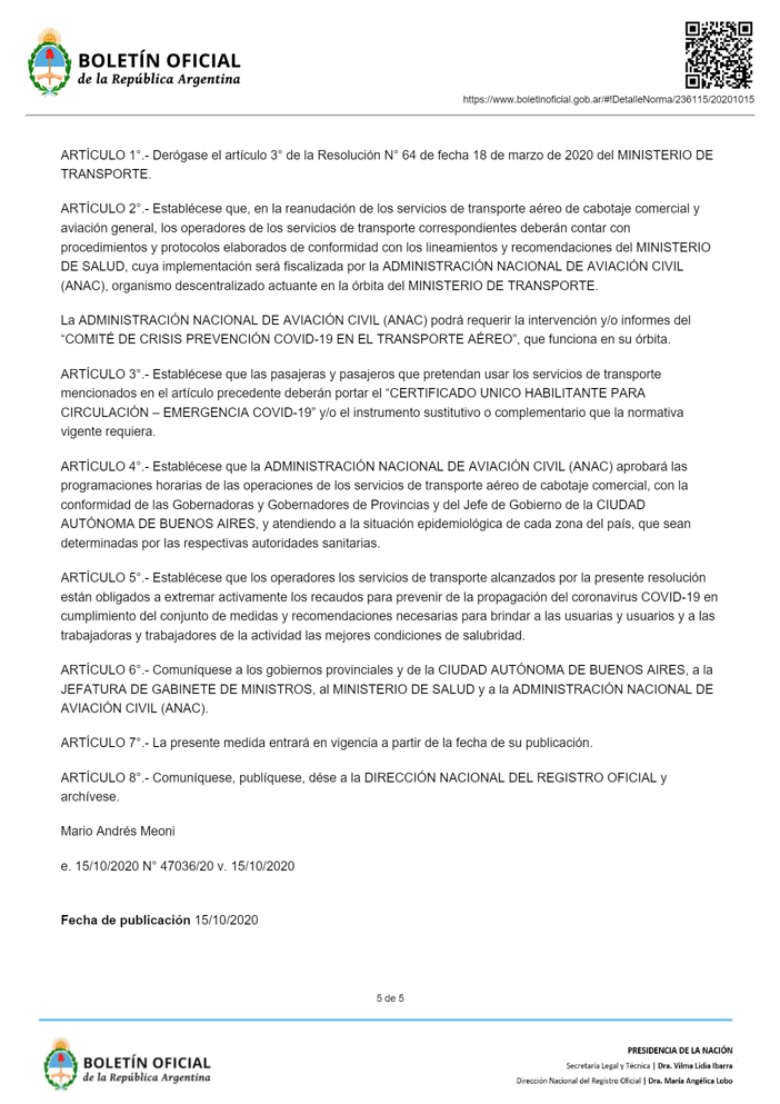 Luego del anuncio realizado ayer en el Aeroparque Jorge Newbery por el ministro de Transporte, Mario Meoni, este jueves fue publicado en el Boletín Oficial la Resolución 221/2020, la cual en su artículo 1° deroga el artículo 3° de Resolución 64/2020 que mantenía suspendidos todos los «servicios de transporte aéreo de cabotaje comercial y de aviación general».