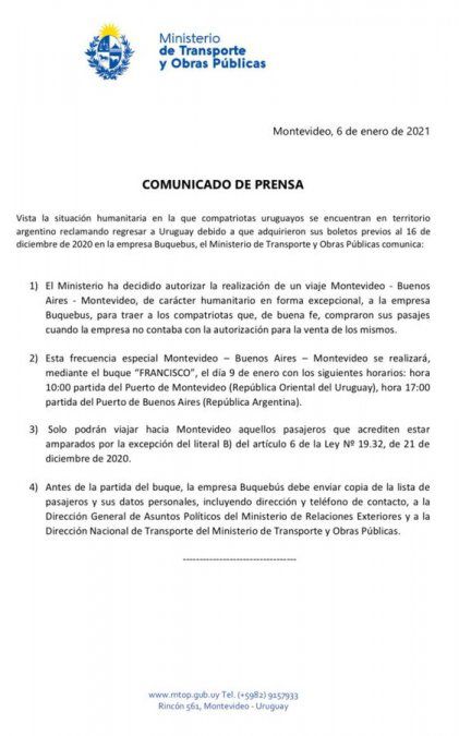 Ante esta situación, que dejó a estos uruguayos sin posibilidad de regresar al país pese a tener los pasajes y estar contemplados en la excepción, el Poder Ejecutivo resolvió autorizar la realización de un viaje excepcional Montevideo- Buenos Aires-Montevideo de carácter "humanitario en forma excepcional". El objetivo es traer a los compatriotas que "de buena fe, compraron sus pasajes cuando la empresa no contaba con autorización para la venta de los mismos", afirma el comunicado del Ministerio de Transporte y Obras Públicas.