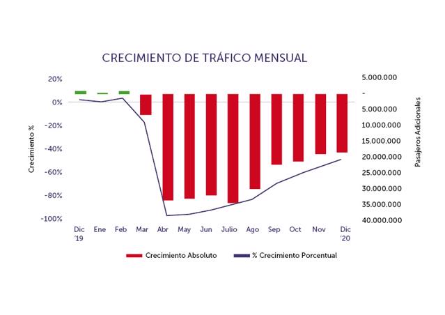 En el gráfico que sigue se puede apreciar que mientras en enero y febrero de 2020 siguió la leve tendencia alcista del tráfico, a partir de marzo comienza un desplome que se hace brutal (caída de más del 80%) en los cuatro meses siguientes (abril a julio). Recién en agosto comienza un leve repunte que se acentúa en setiembre y octubre, pero el tráfico tiende a estancarse en los dos últimos meses del año en alrededor del 50% del de 2019.