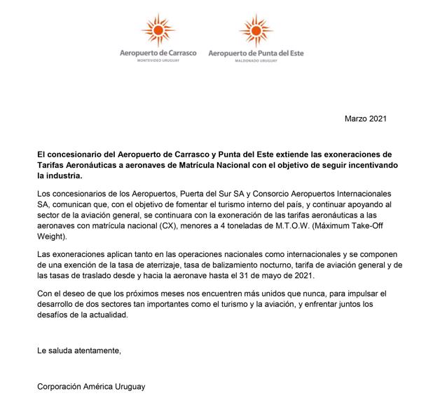 En el marco de la actual pandemia, desde que el gobierno uruguayo decretó que la operación aérea internacional debía efectuarse únicamente en los Aeropuertos de Carrasco y de Punta del Este, desde el último trimestre de 2020, Corporación América Uruguay había decidido no aplicar las tarifas aeronáuticas a las aeronaves con matrícula nacional (CX), menores a 4 toneladas de M.T.O.W (Maximum Take-off Weight). Esas operaciones abarcan las nacionales e internacionales y comprenden a las tasas de aterrizaje, tasa de balizamiento nocturno, tarifa de aviación general y las tasas de traslado desde y hacia la aeronave. La extensión de la exención regirá hasta el próximo 31 de mayo. Esta medida debería ser interpretada como un gran apoyo al turismo interno y fundamentalmente a la industria nacional y resaltada específicamente máxime teniendo en cuenta que el concesionario está transitando, desde la declaración de emergencia sanitaria una caída en sus ingresos por encima del 95%. Compartimos la comunicación oficial