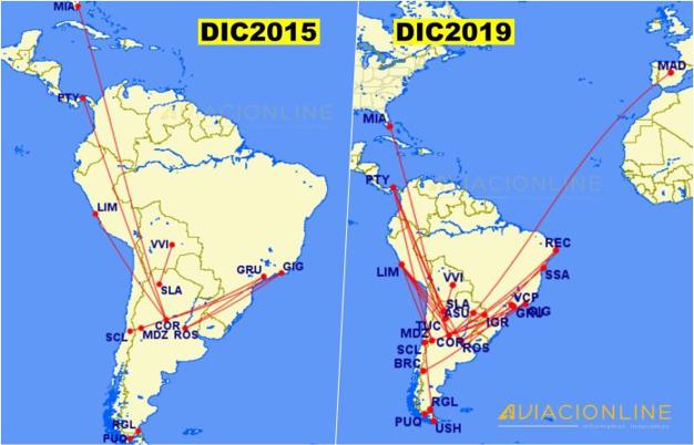 Hacia diciembre de 2019, recesión mediante, el interior tenía 25 rutas internacionales con una oferta semanal de 20.629 asientos en 120 vuelos por sentido de acuerdo a información obtenida por Aviacionline a través de Cirium, versus 12 rutas con unos 74 vuelos semanales y 11.559 asientos por sentido durante diciembre de 2015.