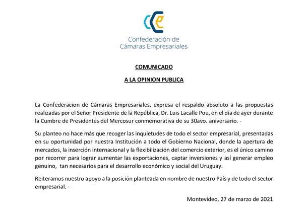 En otra demostración concreta del sentir de la mayoría de los uruguayos, la Confederación de Cámaras Empresariales también expresó su apoyo explícito al Presidente de la República por las insólitas y nada diplomáticas expresiones del Presidente argentino Alberto Fernández en la reciente cumbre del Mercosur, que reaccionó al planteo de Luis Lacalle Pou de las inquietudes del empresariado uruguayo.