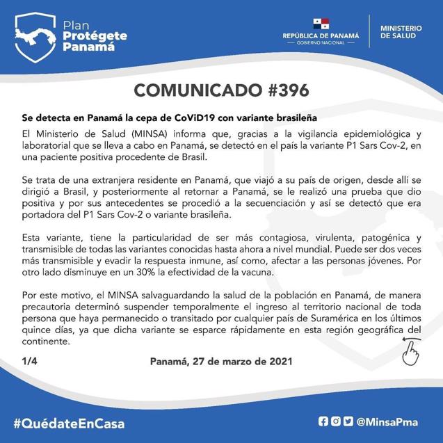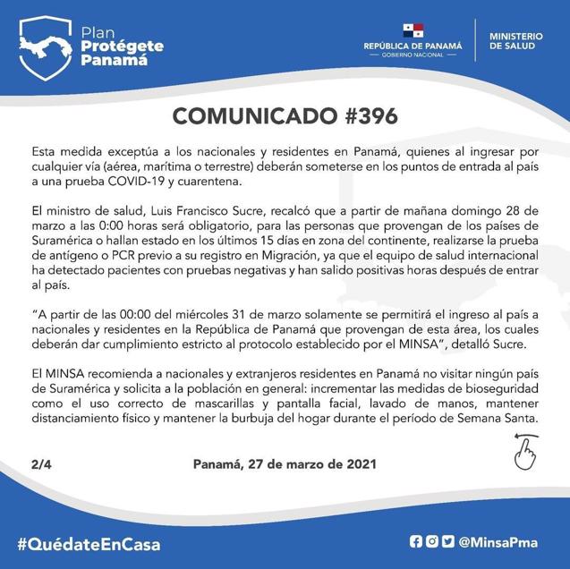 A partir de este domingo, toda persona proveniente de Sudamérica o que hayan estado en dicha región en los últimos 15 días, deberá realizarse un PCR previo a su registro en Migración de Panamá. A partir de las cero horas del 31 de marzo, sólo se permitirá el ingreso a Panamá a los nacionales y residentes que hayan estado en Sudamérica en los 15 días previos, quienes deberán someterse a un test y guardar cuarentena por catorce días. Esta medida no afecta a los pasajeros en tránsito, cualquiera sea su nacionalidad, los que podrán realizar sus conexiones sin ningún inconveniente.