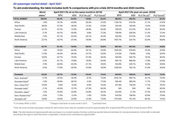 Con el fin de evitar la comparación de los resultados mensuales con los datos distorsionados de abril de 2021 y 2020 por el impacto del COVID-19, IATA realizó la comparación con abril de 2019 (salvo indicación contraria), que se entiende tuvo un comportamiento "normal".