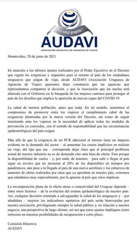 Compartimos comunicado emitido por AUDAVI en relación a las medidas anunciadas por el gobierno de Uruguay en relación a exigencias y requisitos para el retorno de todos los ciudadanos que salgan del país.