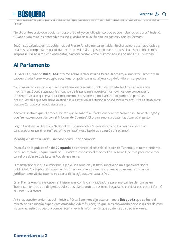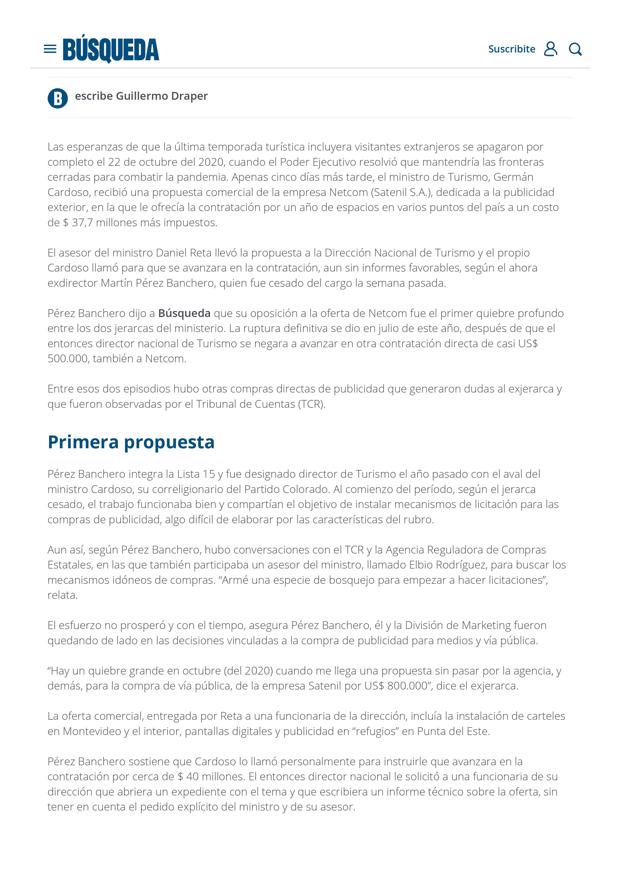 Como fuese anunciado en la pasada jornada por el PDA, llegó el jueves y Búsqueda publicó la información que dijimos iba a dar a conocer. Ya de arranque se puede decir que solamente con leer la nota alcanza para confirmar todo lo que veníamos diciendo durante meses acerca de la gestión de Germán Cardoso. Urgencia, desacuerdo con el Tribunal de Cuentas y en definitiva, la actuación en las negociaciones de los asesores de Cardoso que lo único que hacen al respecto, es agregar sombras a la gestión del ministro más cuestionado del Gabinete de Lacalle Pou. Estamos convencidos que la decisión de apartar del cargo a Germán Cardoso es inminente y quizás, como ocurre casi siempre en Uruguay, sea anunciada mañana, que es viernes...