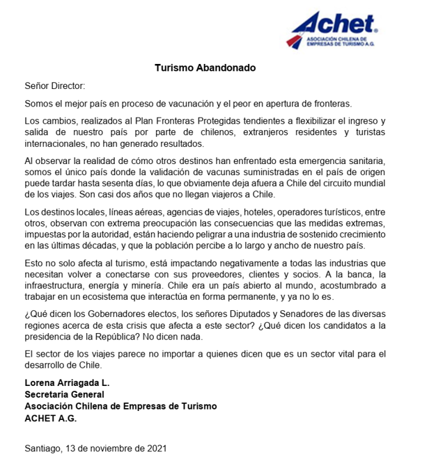 Como es norma del PDA, recibimos y publicamos la siguiente carta pública de la Asociación Chilena de Empresas de Turismo (ACHET), firmada por Lorena Arriagada L., su Secretaria General.