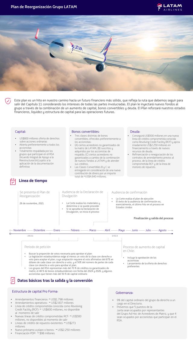 El plan propone la inyección de US$8.190 millones al grupo mediante una combinación de capital fresco, bonos convertibles y deuda, lo que permitirá al grupo salir del Capítulo 11, con la apropiada capitalización para ejecutar el plan de negocios. Tras salir del proceso, se espera que LATAM tenga una deuda total de aproximadamente US$7.260 millones y una liquidez de aproximadamente US$2.670 millones . El grupo ha determinado que se trata de un nivel de endeudamiento conservador y una liquidez adecuada en un periodo de incertidumbre continua para la aviación mundial, y que dejará al grupo en una mejor posición para futuras operaciones.