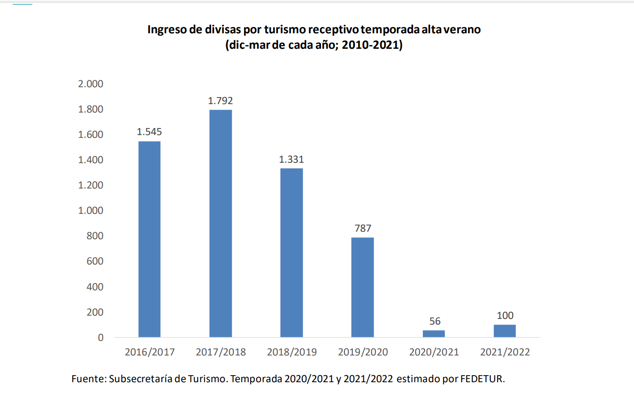 Todas las cifras en la industria, que eran muy positivas hasta mediados del 2019, se han desplomado en los últimos 22 meses. El aporte del turismo receptivo en la temporada alta de verano 2017/2018 fue de U$S 1.792 millones, En la temporada 2020/2021 el ingreso de divisas por turismo receptivo sólo registró un poco más de U$S 56 millones y se espera que esta temporada ingresen cerca de U$S 100 millones.