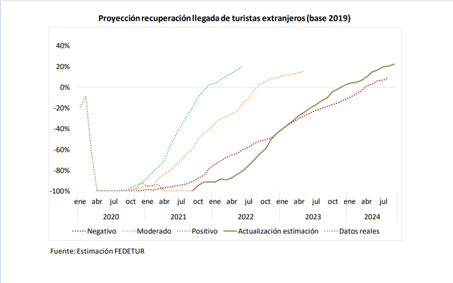 En el siguiente gráfico se puede apreciar las espectativas de recuperación realizadas a mediados de 2020 bajo tres escenarios distintos, y la actualizada en base a la información recogida para este estudio.