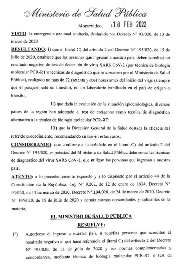 Uruguay da un nuevo paso en la simplificación de las condiciones sanitarias requeridas al ingreso del país. El pasado 1º de noviembre reabrió sus fronteras a extranjeros vacunados, requiriendo además un PCR negativo previo al embarque y otro a los 7 días del primero. El 15 de diciembre fue eliminado el requisito del segundo PCR. Ahora, en una nueva etapa, se establece que el test negativo puede ser PCR o de antígenos, indistintamente. Se mantiene el requisito de vacunación completa. Publicamos la Resolución respectiva.