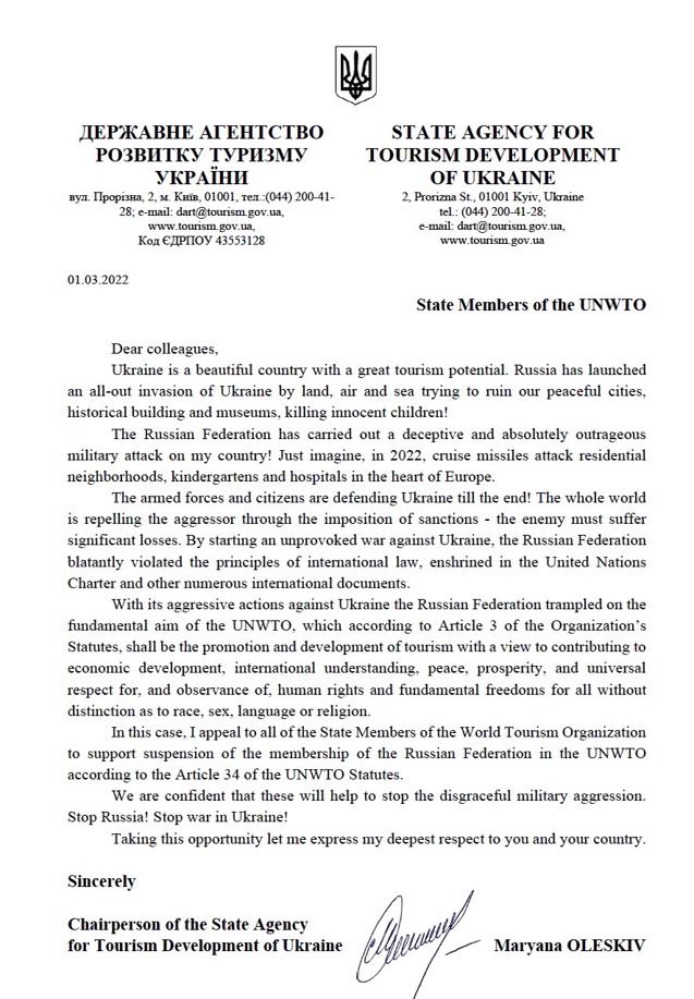 Con sus acciones agresivas contra Ucrania, la Federación de Rusia pisoteó el objetivo fundamental de la OMT, que según el artículo 3 de los Estatutos de la Organización, será la promoción y el desarrollo del turismo con miras a contribuir al desarrollo económico, la comprensión internacional, la paz, prosperidad y el respeto universal y la observancia de los derechos humanos y las libertades fundamentales para todos sin distinción de raza, sexo, idioma o religión.