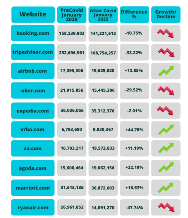 Mediante este análisis, se puede observar el impacto real que la situación de emergencia global ha tenido incluso en los más grandes del sector. En el documento, denominado Comparative Analysis of Top Travel & Tourism Websites’ Traffic Performance Before and After COVID-19, se arrojan algunos datos realmente interesantes, como veremos a continuación.