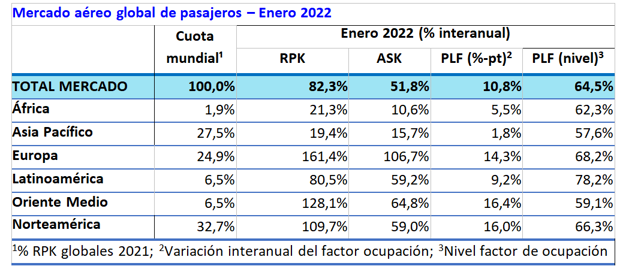 El tráfico global de enero de 2022, medido en pasajeros-kilómetro transportados (RPK, por sus siglas en inglés), subió un 82,3% frente a enero de 2021. El dato desestacionalizado desciende un 4,9% respecto a diciembre de 2021.