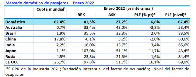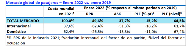 A pesar del fuerte crecimiento interanual del tráfico aéreo registrado en enero de 2022, la demanda de pasajeros se mantiene muy por debajo de niveles pre-COVID-19. Los RPK totales disminuyeron un 49,6% en comparación con enero de 2019. El tráfico internacional disminuyó un 62,4% y el tráfico nacional se contrajo un 26,5%.