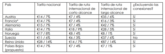 A fines de 2019, el panorama de impuestos a los pasajes aéreos en Europa se muestra en el siguiente cuadro.