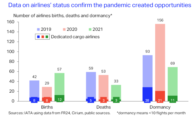 Los cierres de aerolíneas, medidos por el cese del AOC (Certificado de operador aéreo) de las aerolíneas, fueron de 59 en 2019, 53 en 2020, y 33 en 2021. Es evidente que con la pandemia no aumentó el número de cierres, sino todo lo contrario. Además, IATA al inicio de año indicó que la demanda global aumentó un 6,9% en 2021 en comparación con 2019 (niveles pre-COVID) y un 18,7% en comparación con 2020, siendo que la falta de capacidad disponible contribuyó a aumentar los rendimientos y los ingresos de las aerolíneas.