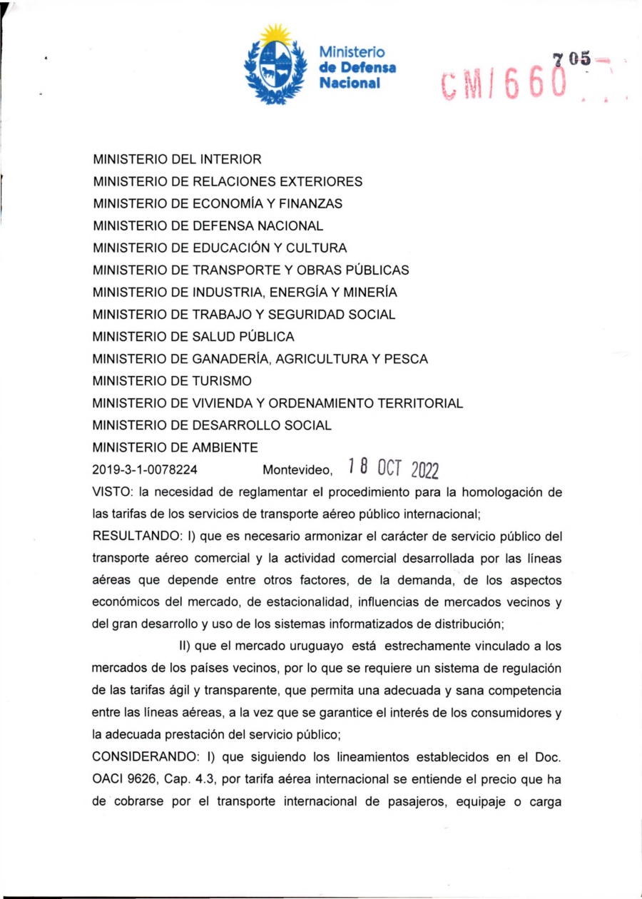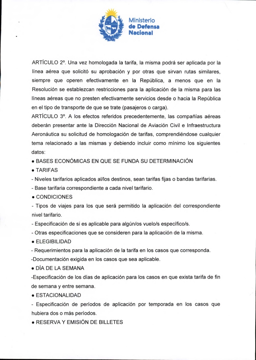 Establece también, en aplicación de criterios modernos de negociación bilateral y multilateral, el registro tarifario, que si bien estaba siendo utilizado por la Autoridad Aeronáutica, no tenía base jurídica en la legislación nacional, ordenando criterios mínimos sobre las condiciones que las tarifas deben tener para su homologación y registro, dejando a salvaguarda la posibilidad de que si un Acuerdo de Trasporte Aéreo vigente que vincula al Uruguay, establece un criterio diferente, debe primar dicho Acuerdo, por sobre el nuevo sistema.