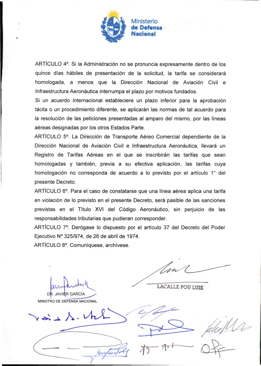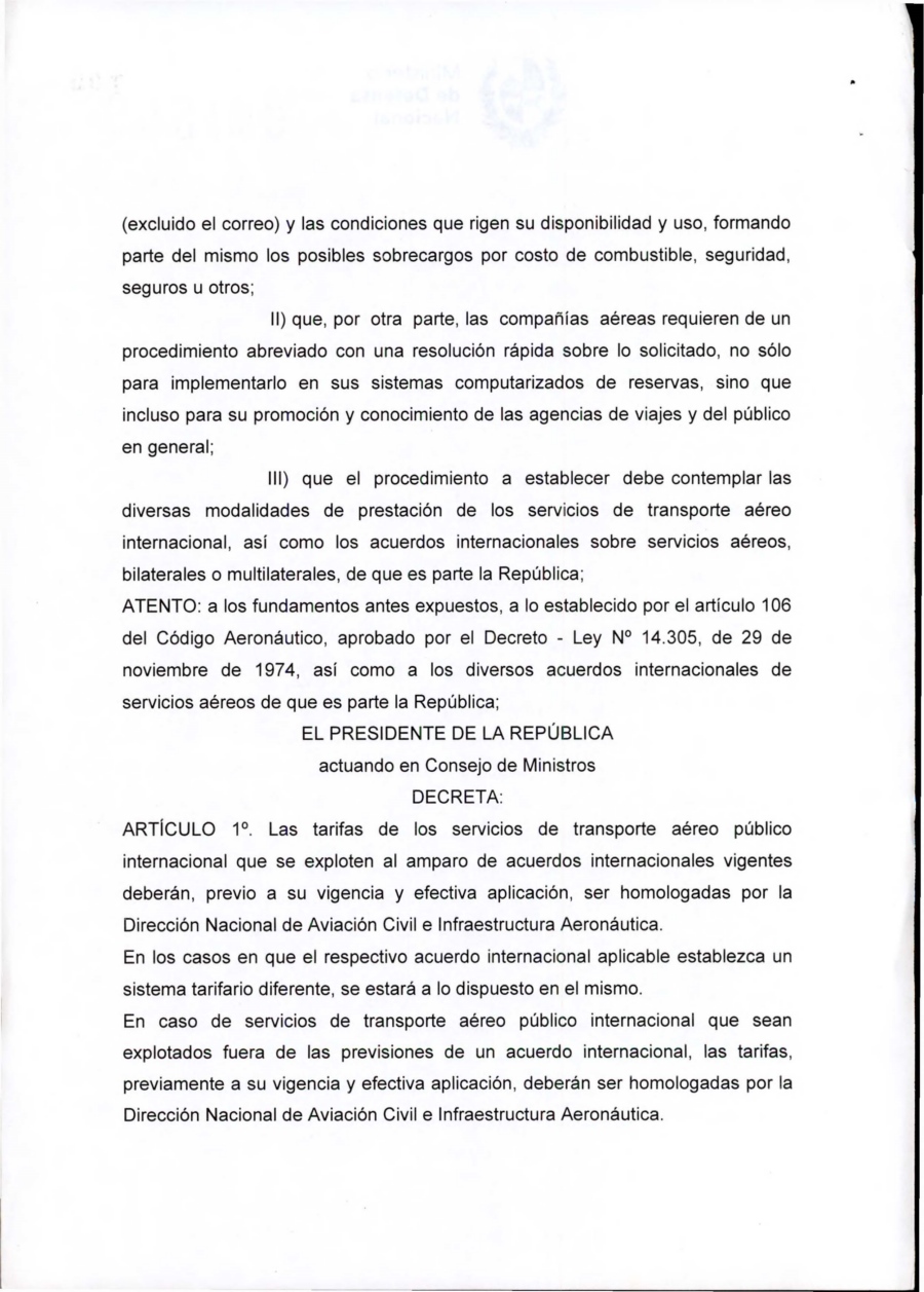 Anteriormente teníamos un sistema, que establecía que las tarifas aéreas de servicios internacionales, debían ser aprobadas por el Poder Ejecutivo, este mecanismo totalmente obsoleto hizo que la norma resultara inaplicable a la nuevas realidades del transporte aéreo, realizándose procedimientos de aprobación sui géneris tendientes a lograr un sistema ágil que no permitiera los clásicos desvíos de tráfico hacia mercados cercanos con la consecuente pérdida de conectividad y recaudación por parte del Estado.
