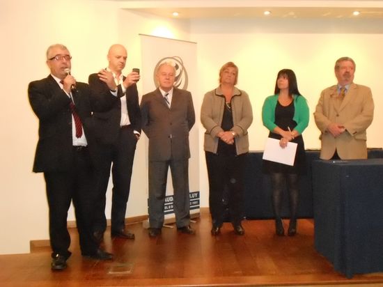Habla el "Maestro de ceremonias" Fernando Cambón; el Subseceretario de Turismo Antonio Carámbula no logra sustraerse al control de las redes sociales ni en el escenario y observan atentamente: Augusto Victorica, Secretario de la Cámara de Turismo; La ministra Liliam Kechichian; Silvana Landoni, la secretaria de AUDAVI homernajeada por cumplir sus primeros 25 años trabajando en la institución y el presidente Giorgio Valenti.