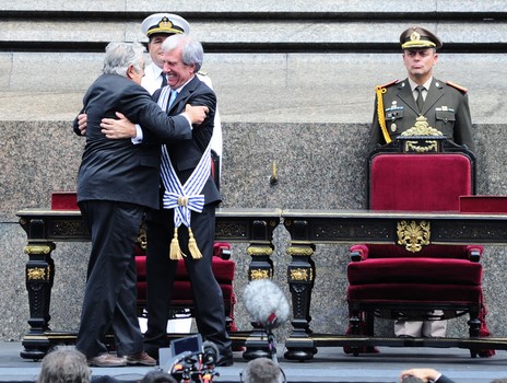 Finalmente, se dirigieron al estrado ubicado en la plaza, frente al Mausoleo del General José Artigas, donde Vázquez recibió la banda presidencial de manos del Presidente saliente, José Mujica, y procedió a dejar instalado el nuevo gabinete ministerial.