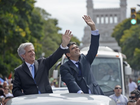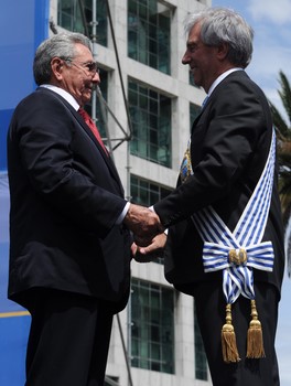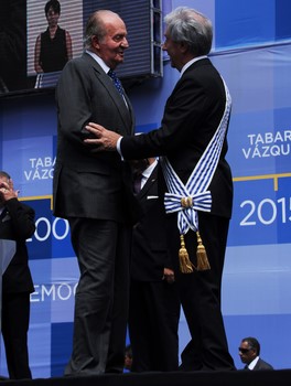 El Rey Juan Carlos saluda a Vázquez.No todo fue clima de fiesta en el mediodía de la Plaza Independencia. Cuando los ministros integrantes del nuevo gabinete se acercaban a firmar el libro que sostenía el escribano de gobierno, se escuchó el primer abucheo y silbidos y el destinatario fue el ministro de Defensa Nacional, Eleuterio Fernández Huidobro quien últimamente ha desatado una fuerte polémica a partir de sus dichos en temas relacionados con la búsqueda de desaparecidos cuando hizo fuertes críticas a la ONG Serpaj provocando que la organización de familiares de detenidos y desaparecidos dijo que no lo quería en el nuevo gobierno. Cabe recordar que Huidobro fue uno de los "nueve rehenes" de la dictadura militar uruguaya.