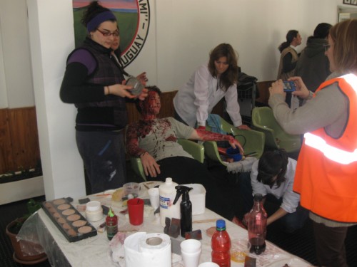 Participaron estudiantes de UTU y la Universidad Católica actuando maquillados para imprimir relismo a la situación.