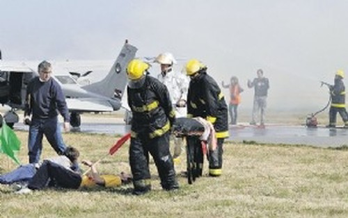 Alrededor de las 14.30 horas en el Aeródromo Angel S. Adami de Melilla, fue simulado el accidente de una avioneta que iniciaba la maniobra de aterrizaje forzoso, con dos heridos graves, un muerto y una persona ilesa.