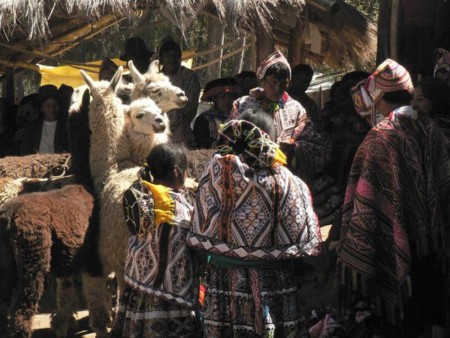 La celebración se desarrollaba en una extraordinaria escenografía, en el pequeño patio central del caserío de adobe, con músicos y todo. El grupo de familias, envueltas en los colores y dibujos de sus trajes, todos diferentes, se completaba con las belísimas mantas donde descansaban los niños, vigilados de cerca por el grupo de matronas de grandes sombreros sentadas en sillas.
