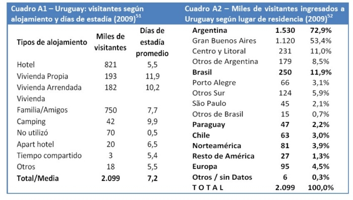 La mayoría de los turistas que ingresaron al país en 2009 residen en Argentina (73%) y Brasil (12%), pero también llegaron en gran número al país residentes chilenos y paraguayos. Los residentes europeos y norteamericanos constituyeron el 8,4% del total. Véase Anexo, Cuadro A2.
