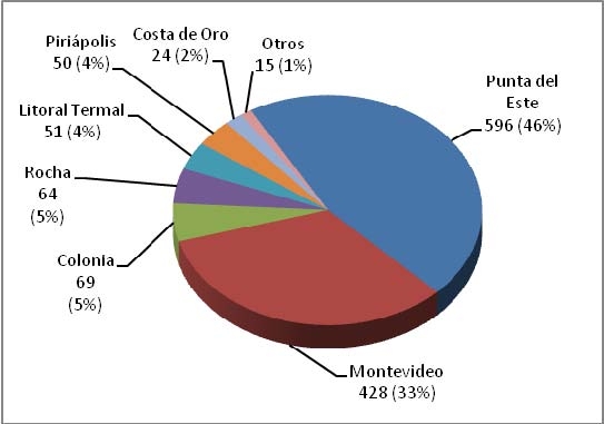 El gasto total de los visitantes en 2009 fue de US$ 1.300 millones, siendo Punta del Este el destino principal con un 46% del gasto total, seguido por Montevideo con 33%.