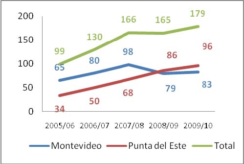 El número de cruceros que hacen escala en Montevideo y Punta del Este ha aumentado en las últimas cinco temporadas. Los cruceros arribados pasaron de 99 en 2005/06 a 179 en 2009/10 y las personas desembarcadas lo hicieron de 111.000 en 2005/06 a casi 300.000 en 2009/10, como se muestra en las dos gráficas siguientes.