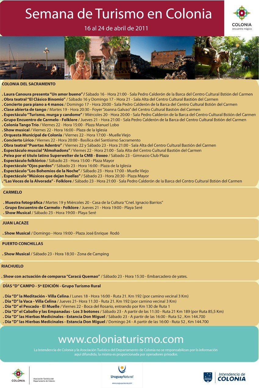 Por aquí termina este raid fotográfico. Quisimos compartir una parte solamente, de todos los registros que nos trajimos de una incursión por este departamento, al que nos une, además de la admiración, la sangre de nuestros ancestros. Falta mucho más, de lo que capturamos y de lo que nos faltó, sobremanera Carmelo, Juan Lacaze y la mediática Conchillas, pero eso, será excusa para un nuevo viaje. Espero que hayan disfrutado. Más abajo, la programación para Semana de Turismo (derecho viejo), que nos hizo llegar la gente del gobierno local-