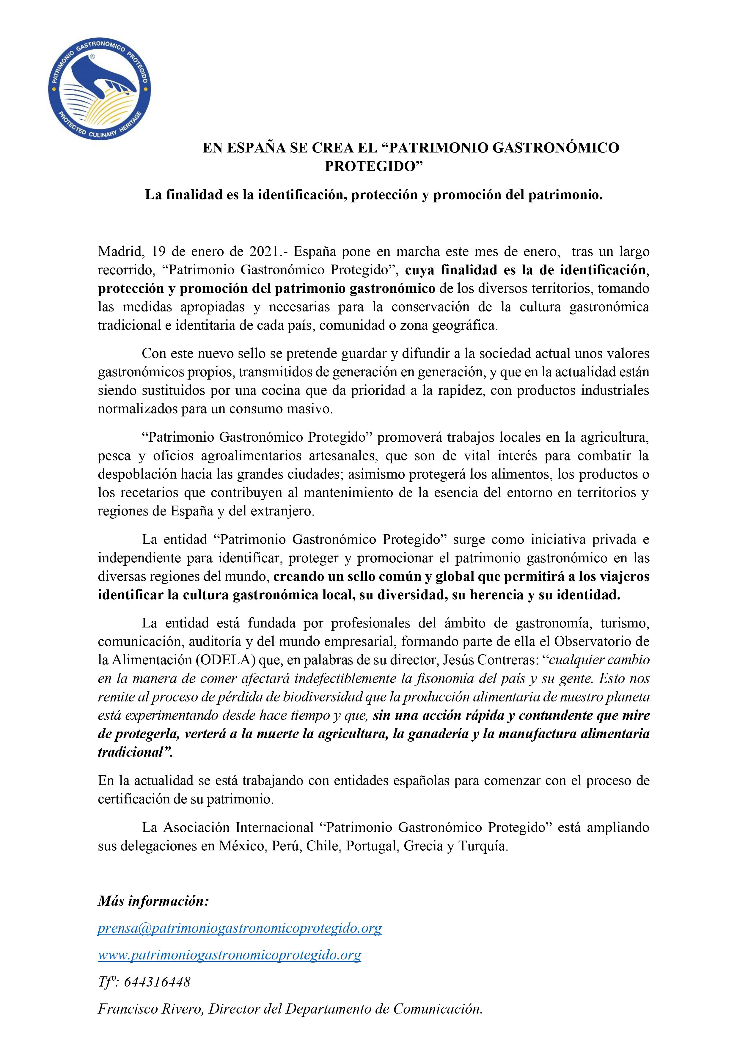 En los últimos días, la Asociación para la Protección del Patrimonio Gastronómico, institución a la que me he sumado para colaborar con sus objetivos, anunció: “EN ESPAÑA SE CREA EL PATRIMONIO GASTRONÓMICO PROTEGIDO”, subtitulando: “La finalidad es la identificación, protección y promoción del patrimonio”.