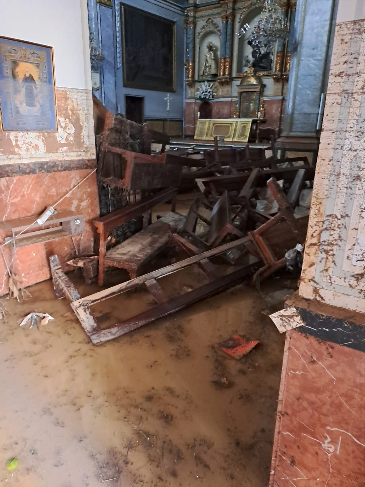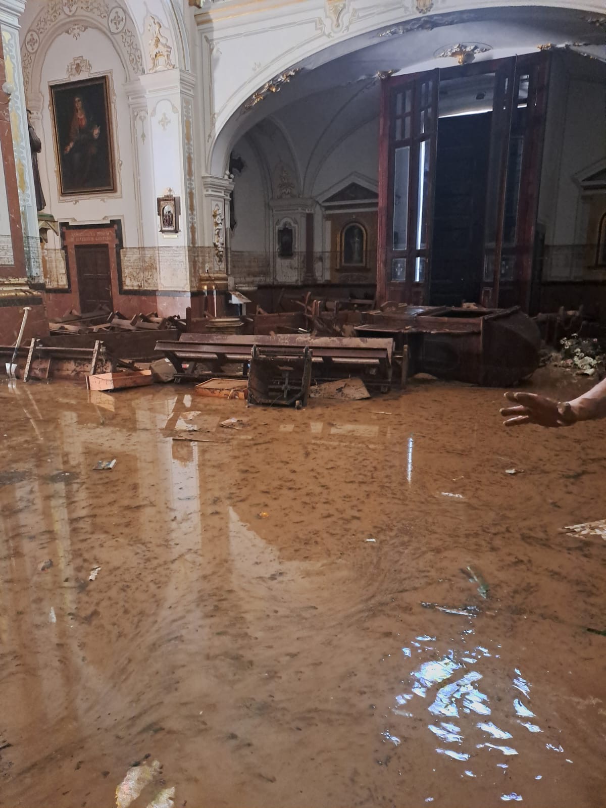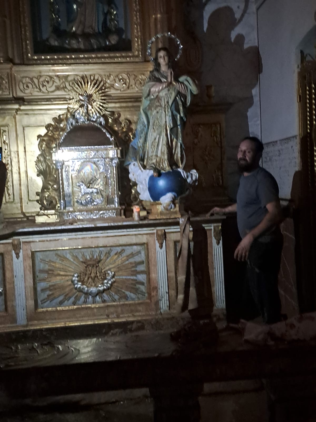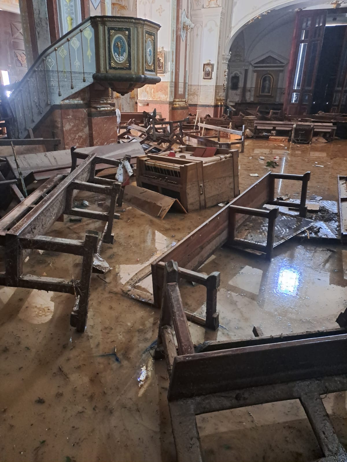 La devastación es inimaginable, la ciudad semi destruida, la gente aislada, sin agua, sin luz, sin alimentos, con 45 fallecidos según la Alcaldía y un número no determinado de desaparecidos, y algo que nos impactó como contra cara de lo que vivimos en Torremolinos de admirar el Arte Sacro, la Parroquia de San Jorge Mártir arrasada por la DANA, justamente una de las Parroquias que atiende el Padre Gustavo Riveiro, con el cual nos comunicamos con serios problemas técnicos, pero logró enviarnos unas fotos que nos entristecen.