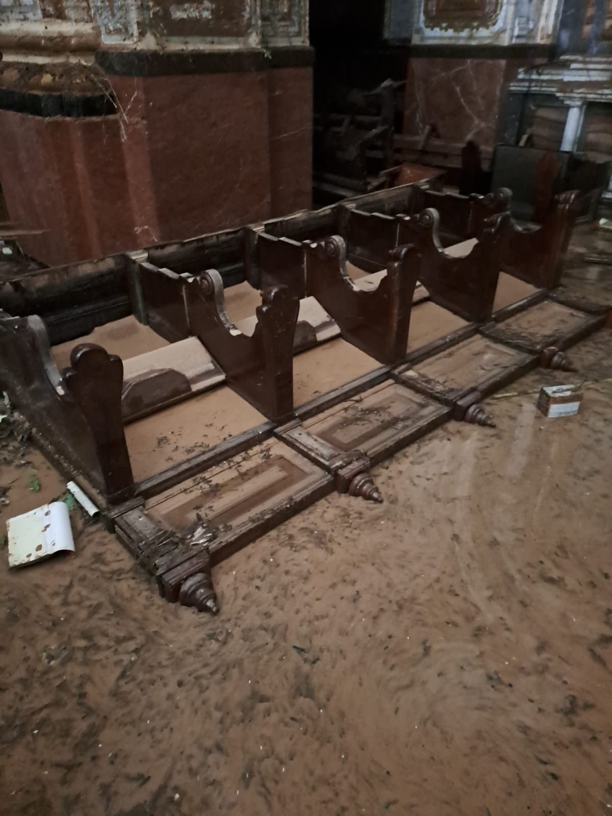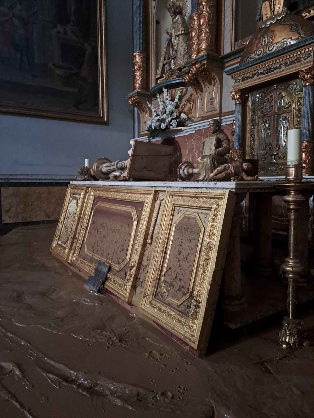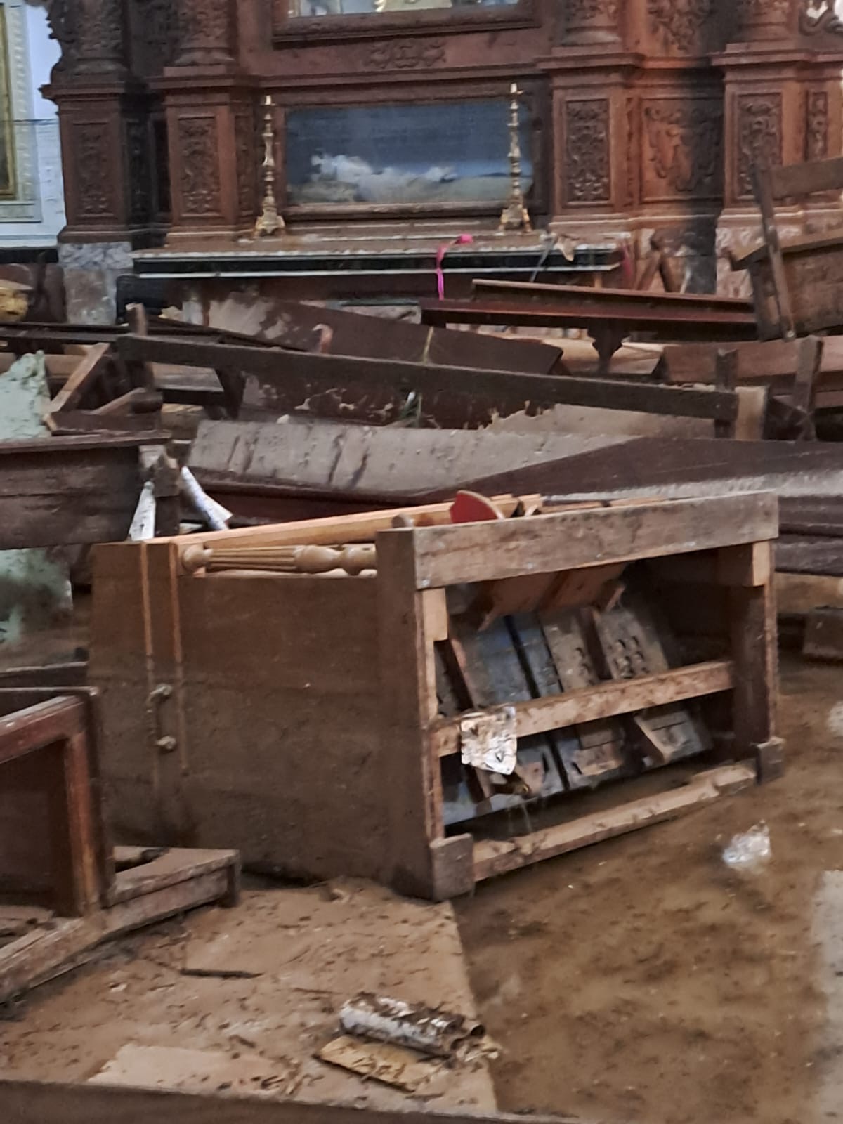 La devastación es inimaginable, la ciudad semi destruida, la gente aislada, sin agua, sin luz, sin alimentos, con 45 fallecidos según la Alcaldía y un número no determinado de desaparecidos, y algo que nos impactó como contra cara de lo que vivimos en Torremolinos de admirar el Arte Sacro, la Parroquia de San Jorge Mártir arrasada por la DANA, justamente una de las Parroquias que atiende el Padre Gustavo Riveiro, con el cual nos comunicamos con serios problemas técnicos, pero logró enviarnos unas fotos que nos entristecen.